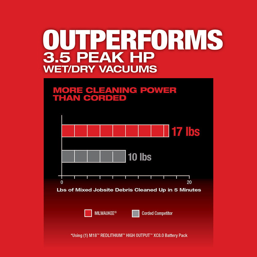 The MILWAUKEE M18 FUEL 6 Gallon Wet/Dry Vacuum brings unmatched performance, durability, and versatility to jobsite cleanup. The POWERSTATE Brushless Motor and optimized components Outperform 3.5 Peak HP Wet/Dry Vacuums, delivering more cleaning power than corded. The wet/dry vac cleans up more common jobsite debris like drywall dust, concrete dust, and wood/metal shavings than 3.5 peak HP wet/dry vacuums in the same amount of time. This wet/dry vacuum provides the Most Durable Wheels and Hoses with reinforced casters and tread design for up to 8X wheel life. The crush and twist-resistant hose construction deliver up to 2X hose life. This vac is part of the Most Versatile Wet/Dry Vacuum System with interchangeable motor heads, tanks, and carts for varying performance, holding capacity, and mobility with the easy access foot pedal. MAX POWER MODE delivers up to 31 minutes of continuous cleaning time (up to 1,000 ft) per charge on an M18 REDLITHIUM HIGH OUTPUT HD12.0 Battery Pack. MAX RUN-TIME MODE delivers up to 47 minutes of continuous cleaning time (up to 1,300 ft) per charge on an HD12.0 Battery Pack. The included Large High-Efficiency Filter ensures optimal dust and microparticle collection. Milwaukee Fleece Dust Bags can be used for less debris build-up on the filter. Integrated accessory storage allows for easy access to the crevice tool and utility nozzle on the motorhead, with more accessory storage spots on the removable wet/dry vacuum cart.