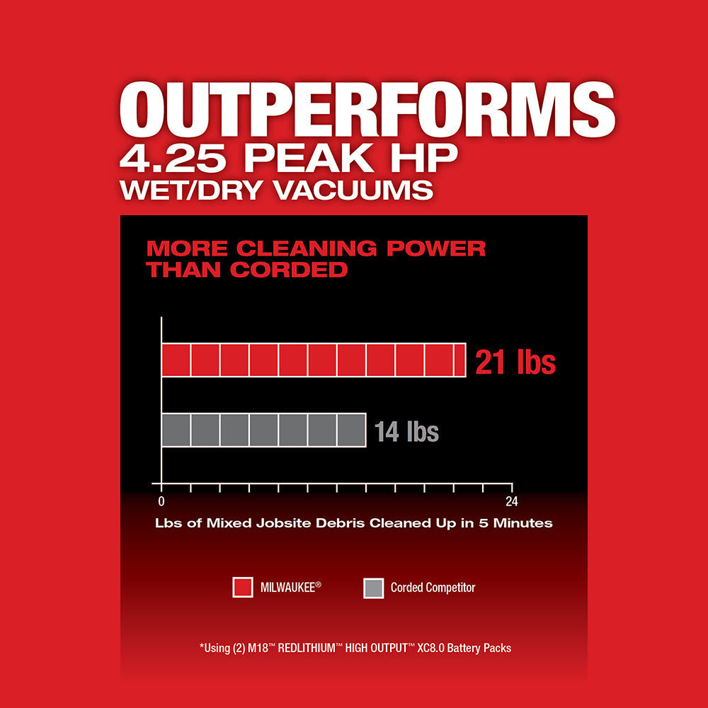 The MILWAUKEE M18 FUEL 9 Gallon Wet/Dry Vacuum brings unmatched performance, durability, and versatility to jobsite cleanup. The POWERSTATE Brushless Motor and optimized components Outperform 4.25 Peak HP Wet/Dry Vacuums, delivering more cleaning power than corded. The Dual-Battery Motor Head requires (2) M18 REDLITHIUM Batteries to operate and cleans up more common jobsite debris like drywall dust, concrete dust, and wood/metal shavings than 4.25 peak HP wet/dry vacuums in the same amount of time. This wet/dry vacuum provides the Most Durable Wheels and Hoses with reinforced casters and tread design for up to 8X wheel life and crush and twist-resistant hose for up to 2X hose life. This vac is part of the Most Versatile Wet/Dry Vacuum System with interchangeable motor heads, tanks, and carts for varying performance, holding capacity, and mobility with the easy access foot pedal. MAX POWER MODE delivers up to 34 minutes of continuous cleaning time (up to 1,400 ft) and up to 49 minutes (up to 1,600 ft) on MAX RUN-TIME MODE per charge on (2) M18 REDLITHIUM HIGH OUTPUT HD12.0 Battery Packs. The included Large High-Efficiency Filter ensures optimal dust and microparticle collection. Milwaukee Fleece Dust Bags can be used for less debris build-up on the filter. Cart accessory storage allows for easy access to accessories when needed.