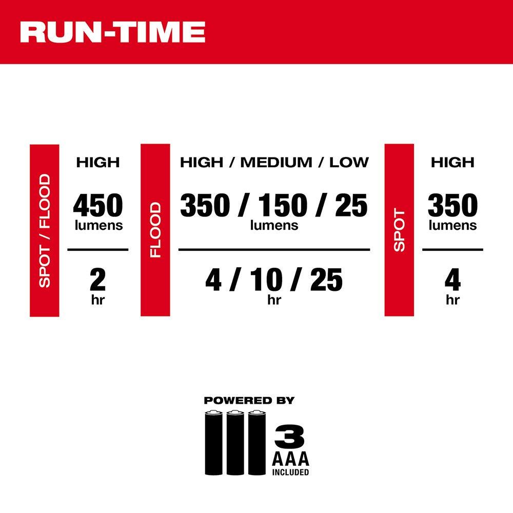 • 5 Light Output Modes: Hybrid Spot/Flood mode: 450-Lumens- 2 hours; Flood High mode: 350-Lumens- 4 hours; Medium mode: 150-Lumens- 10 hours; Low: 25-Lumens- 25+ hours; Spot High: 200-Lumens- 4 hours