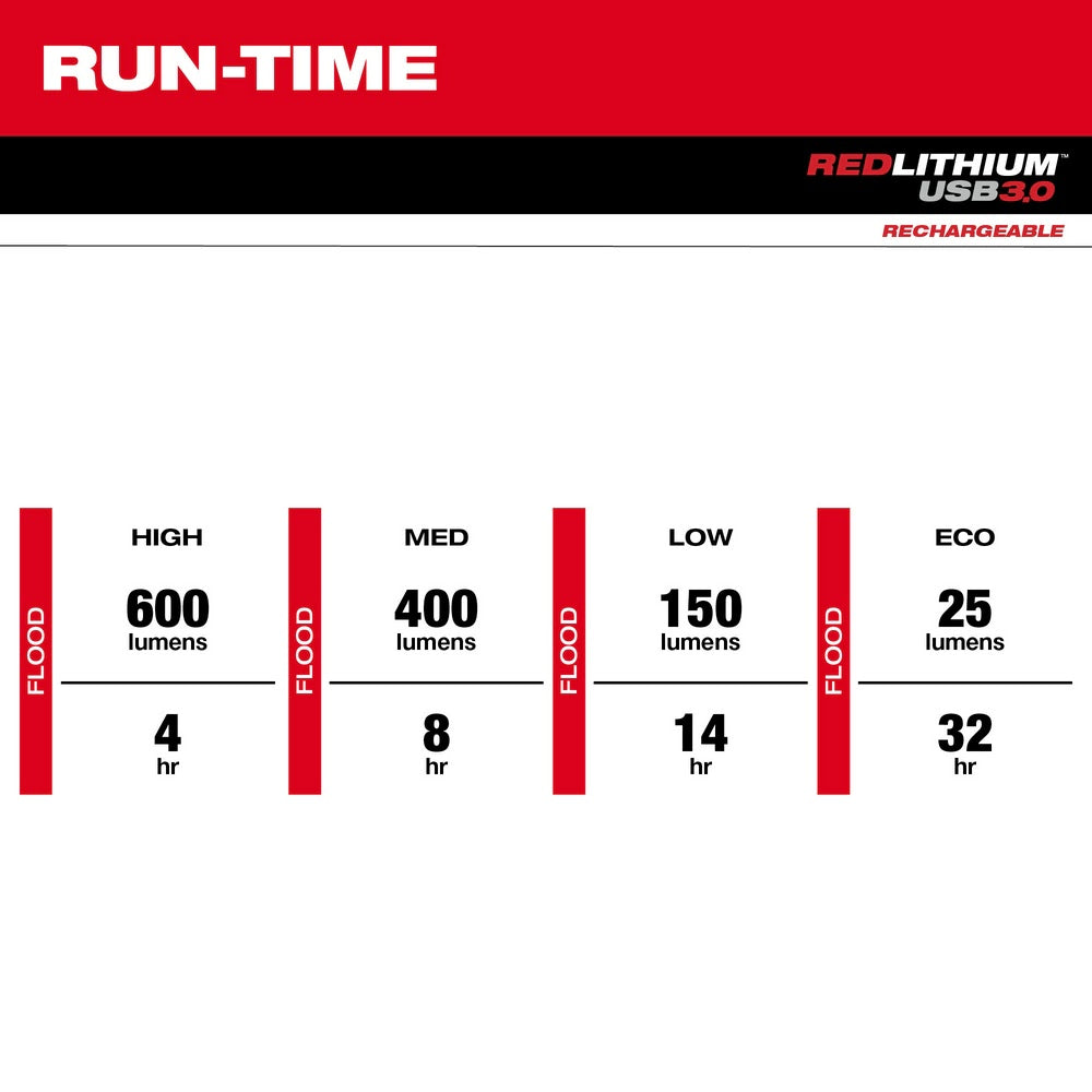 • 4 Light Output Modes: Flood High Mode: 600-lumens- 4 hours, Medium Mode: 400 lumens - 8 hours, Low Mode: 150 lumens - 14 hours, ECO Mode: 25 lumens - 32 hours