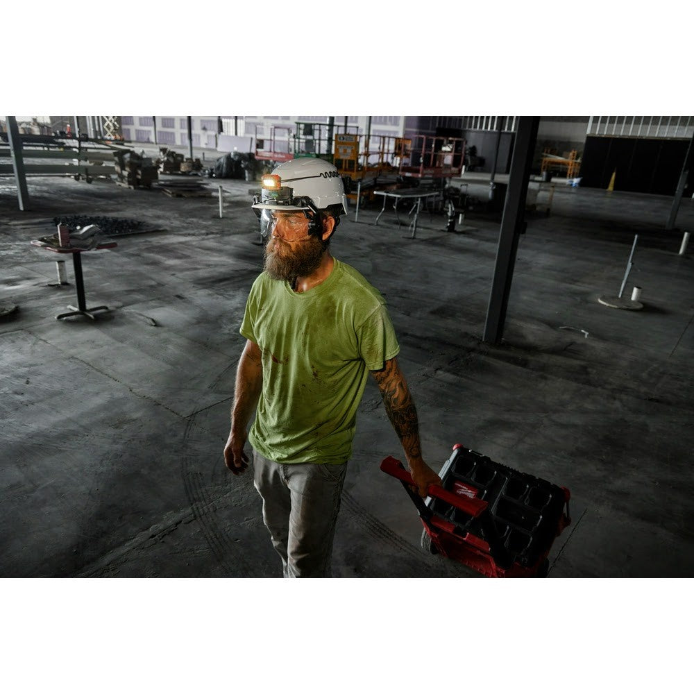 The BOLT REDLITHIUM Headlamp is a dedicated solution for our BOLT hard hats and helmets and is fully compatible with all BOLT accessories. The MILWAUKEE BOLT headlamp offers an ultra-thin light head that allows for full functionality of any Bolt Face shield and visor. The headlamp delivers 600 lumens of TRUEVIEW High Definition Flood Lighting paired with a 70° pivoting light head for full illumination for any task. This rechargeable headlamp is designed with the cam lock mounted battery pack in the rear for maximum maneuverability and security in tight spaces and a balanced design for all-day use. The Milwaukee headlamp has four light output modes: High, Medium, Low, and Eco for 32 hours of runtime to maximize light output or extend runtime. The light is IP54 rated for water and dust resistance and can withstand up to 2M drops, surviving the toughest conditions on and off the jobsite. The BOLT REDLITHIUM Headlamp is powered by the REDLITHIUM USB 3.0AH Battery, providing all-day run-time, more recharges, and 3x faster charge time. The MILWAUKEE REDLITHIUM USB Battery can be recharged in the headlamp via USB-C or swapped out with additional REDLITHIUM USB Batteries for virtually no downtime. The BOLT Headlamp is covered by a limited lifetime warranty.