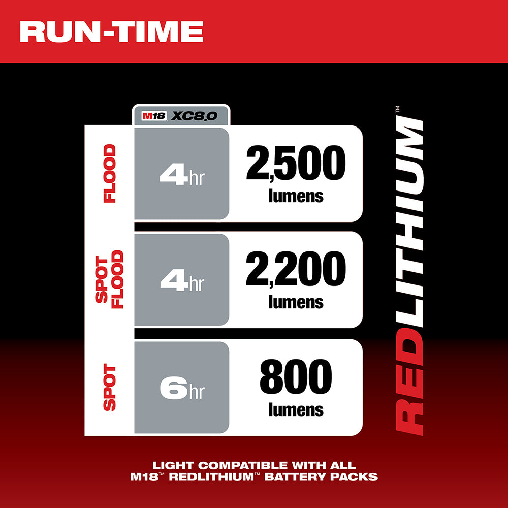 • Spot/Flood mode: 4hrs with M18 REDLITHIUM High Demand 9.0 Battery Pack
