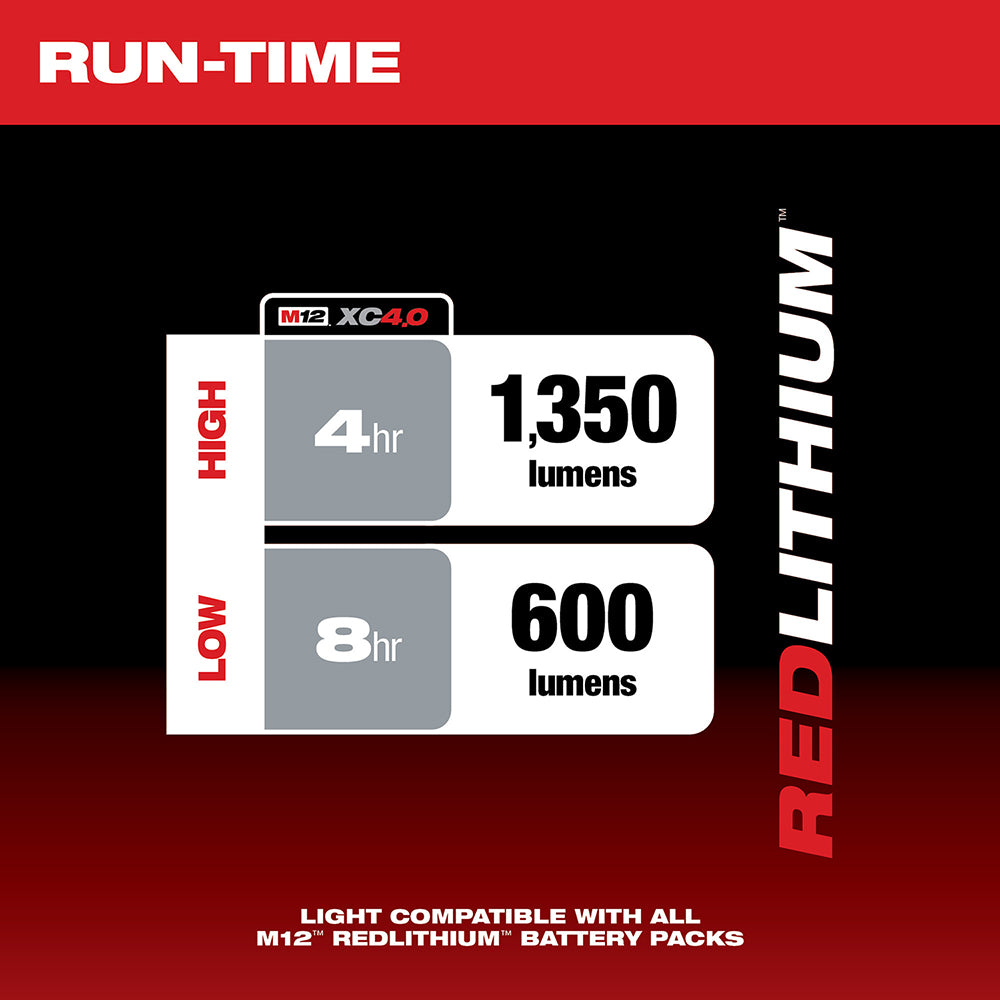 • Runtime With M12 4.0 Pack on Low: 8hrs