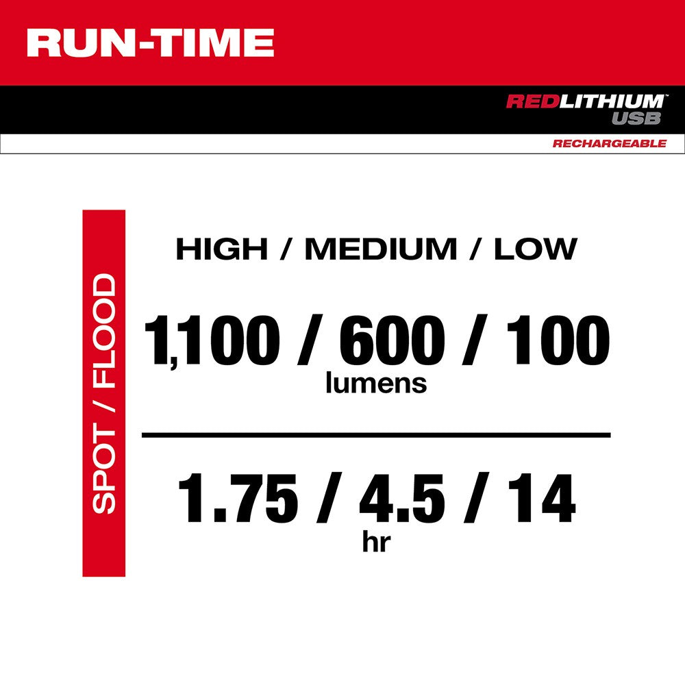 The MILWAUKEE® USB Rechargeable 1100L Twist Focus Flashlight offers 1100 Lumens with precise beam control. Leveraging advances in LED Technology, this rechargeable flashlight maintains a compact body while delivering 1100L of TRUEVIEW™ High Definition Output for the ability to see up to 175-meters (574 feet). The flashlight features precision twist focusing for full control of the beam size and intensity to search, trace, or inspect better. Designed for easy carry and storage, this compact flashlight has a removable clip for versatile attachment. Optimized for one-click operation and ease of use, the multi-functional power button offers battery indication and mode selection. The mode memory intelligence powers up the flashlight in the last mode used. Maximize brightness or extend runtime with high, medium, and low mode options with up to 14 hours of runtime. Built for the toughest conditions on and off the job site, this flashlight is rated for 4M drops and with an IP67 rating, its fully waterproof and dustproof able to withstand submersion up to 1M. The USB Rechargeable 1100L Twist Focus Flashlight is powered by the REDLITHIUM™ USB 3.0AH Battery, providing all-day run-time, more recharges, and 3x faster charge time. The Milwaukee REDLITHIUM™ USB Battery can be recharged in the flashlight via Micro USB or swapped out with additional REDLITHIUM™ USB Batteries for virtually no downtime. The 1100L Twist Focus Flashlight is covered by a limited lifetime warranty.