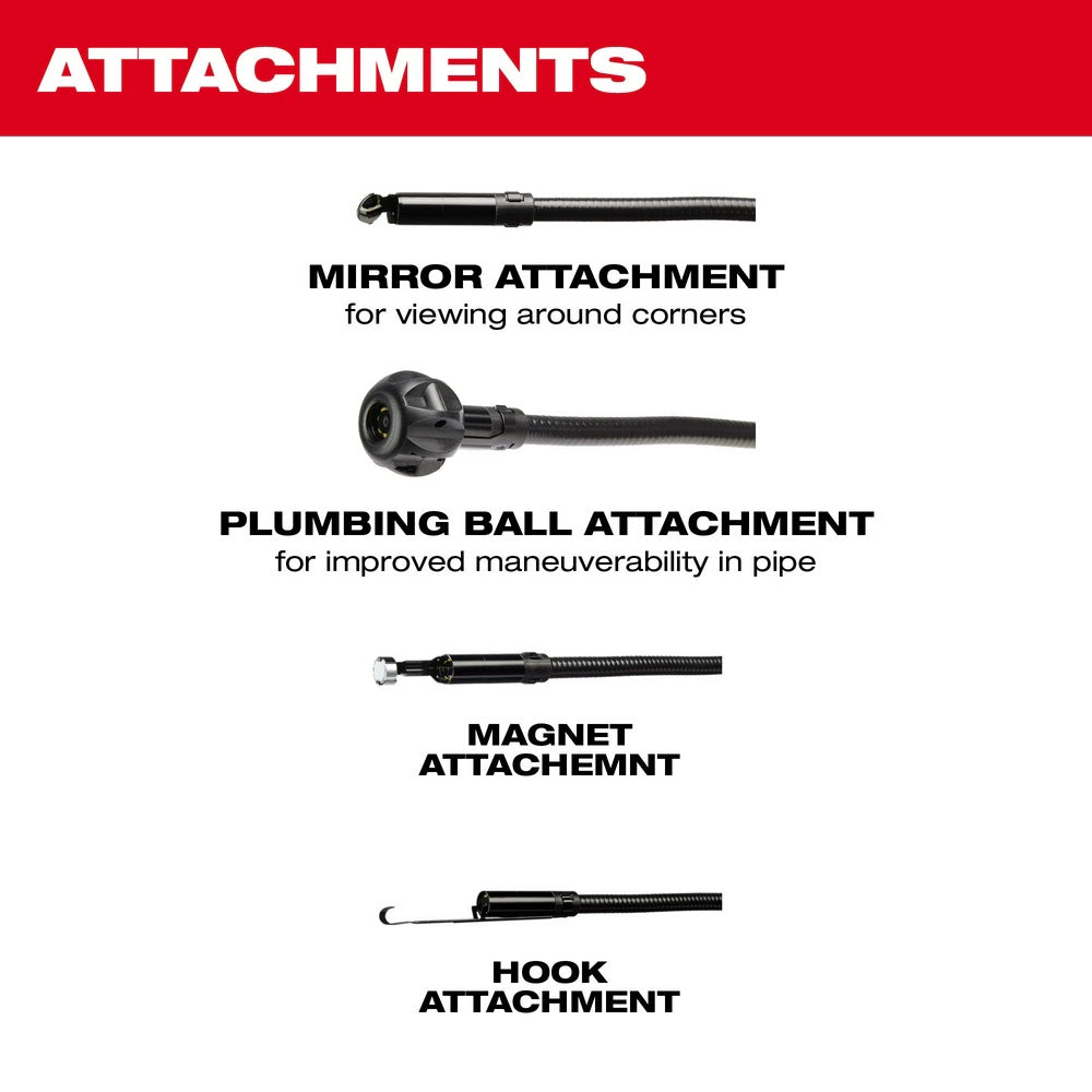 The MILWAUKEE M12 M-Spector 360 4 Inspection Camera? Kit delivers clearer images for easier inspections. The 4.3” LCD screen with 720p camera provides crisp, clear images. The 10mm camera head allows for easy access while the cable balances flexibility and rigidity for both drain line and behind wall inspections. Conveniently share photos and videos via SD card. The M-Spector 360 features 360° image rotation for easy adjustment by physically rotating the screen or with a push of a button. Quickly focus on points of interest with 3 levels of zoom. This plumbing inspection camera also includes a 5-mode brightness adjustment to change the LED output.
