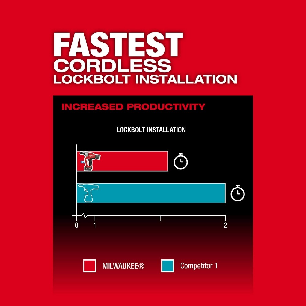 The MILWAUKEE M18 FUEL™ 1/4” Lockbolt Tool w/ ONE-KEY™ is the fastest lockbolt tool in the market. It eliminates the need for hoses and compressors while delivering up to 2X the speed of application compared to other cordless lockbolt tools. This solution will install up to 1,200 1-1/4” Aluminum Magna Grip Lockbolts on a single charge of the M18™ REDLITHIUM™ XC5.0Ah battery (not included). The POWERSTATE™ Brushless Motor delivers 4,500 lbs. (20kN) of pulling force to install Magna-Grip, C6L, C120L, Bobtail, Hucktainer Lockbolts (with Adapter) and 3/16 through 9/32 Blind Rivets (with purchase of M18 1/4 Lockbolt to Blind Rivet Tool Conversion Kit), installing the widest range of riveting fasteners in the market. While lightweight, the Milwaukee Lockbolt Tool was designed to withstand harsh shop or assembly plant environments, manufactured with an all-metal gearcase, impact strength plastics, and protective over-mold. M18™ REDLITHIUM™ Battery Packs fit all M18™ tools, providing you with more work per charge and more work over the battery life. REDLINK PLUS™ Intelligence ensures maximum performance and protects the Lockbolt tool and battery against overloads, over-heating, and over-discharge. The MILWAUKEE® M18 FUEL™ ¼” Lockbolt Tool has ONE-KEY™ compatibility, allowing you to track and manage your tool.