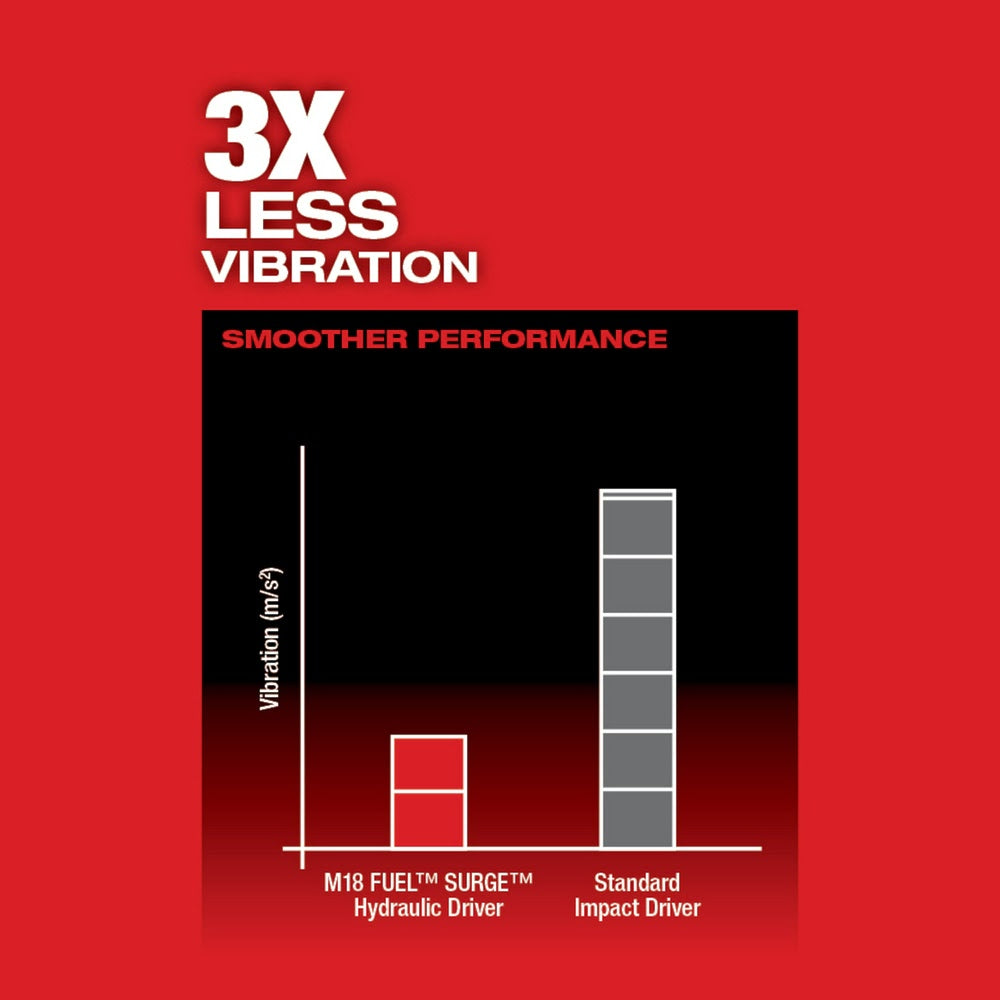 The M18 FUEL™ SURGE™ 1/4 Hex Hydraulic Driver is the quietest cordless fastening solution on the market. With Milwaukees new FLUID-DRIVE™ Hydraulic Powertrain, users will experience up to 50% quieter operation, 3X less vibration for smoother operation, and faster driving speeds compared to standard impacts . The POWERSTATE Brushless Motor delivers up to 0-3,000 RPM with constant power output to drive screws faster. REDLINK PLUS Intelligence is the most advanced electronic system on the market, preventing damage to the tool and battery caused by overloading or overheating. For use with REDLITHIUM Compact Batteries or Extended Capacity Batteries, which deliver more work per charge and more work over the life of the pack than competitive batteries on the market. The 4-Mode DRIVE CONTROL provides greater control over output speed and power for greater versatility. Self-Tapping Screw Mode is designed to reduce walking when starting self-tapping screws as well as reduce overdriving, breaking and stripping out screws.