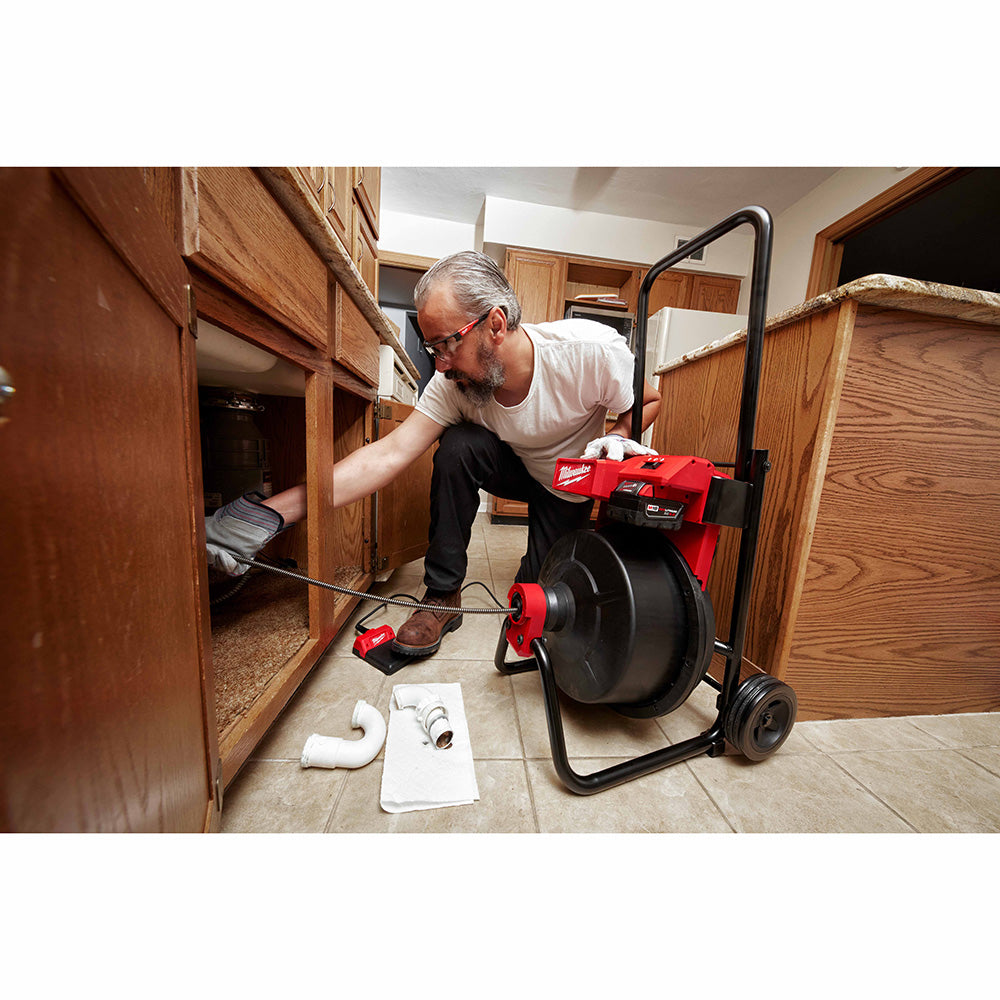 The MILWAUKEE® M18™ Drum Machine with a 3/8 cable allows you to clean drains confidently with instant setup. This M18™ Drum Machine provides more power than corded machines to tackle tough blockages like grease, scale, and build-up. It can clear drains out to 100 with a 3/8 cable or 75 with 1/2 cable. The included 3/8 cable is best for use in 1-1/2- 3 drain lines. For larger drain lines up to 4”, the machine is compatible with 1/2” cables. Complete multiple jobs on one battery charge while simultaneously eliminating the hassle of extension cords and finding electrical outlets, providing access to power anywhere. The enclosed drum and lightweight design allow for cleaner, easier transportation on and off the job. The Milwaukee M18™ Drum Machine is compatible with MILWAUKEE® CABLE DRIVE™ Assembly (47-53-2816) which gives you the capability to automatically feed and retract cable up to 15-20 feet per minute. Additional cable sizes and drum are available in 3/8 x 100 (48-53-2777) and 1/2 x 75 (48-53-2778), drum only (47-53-2817).
