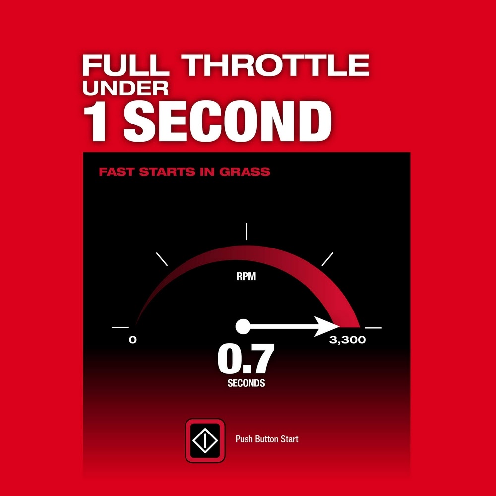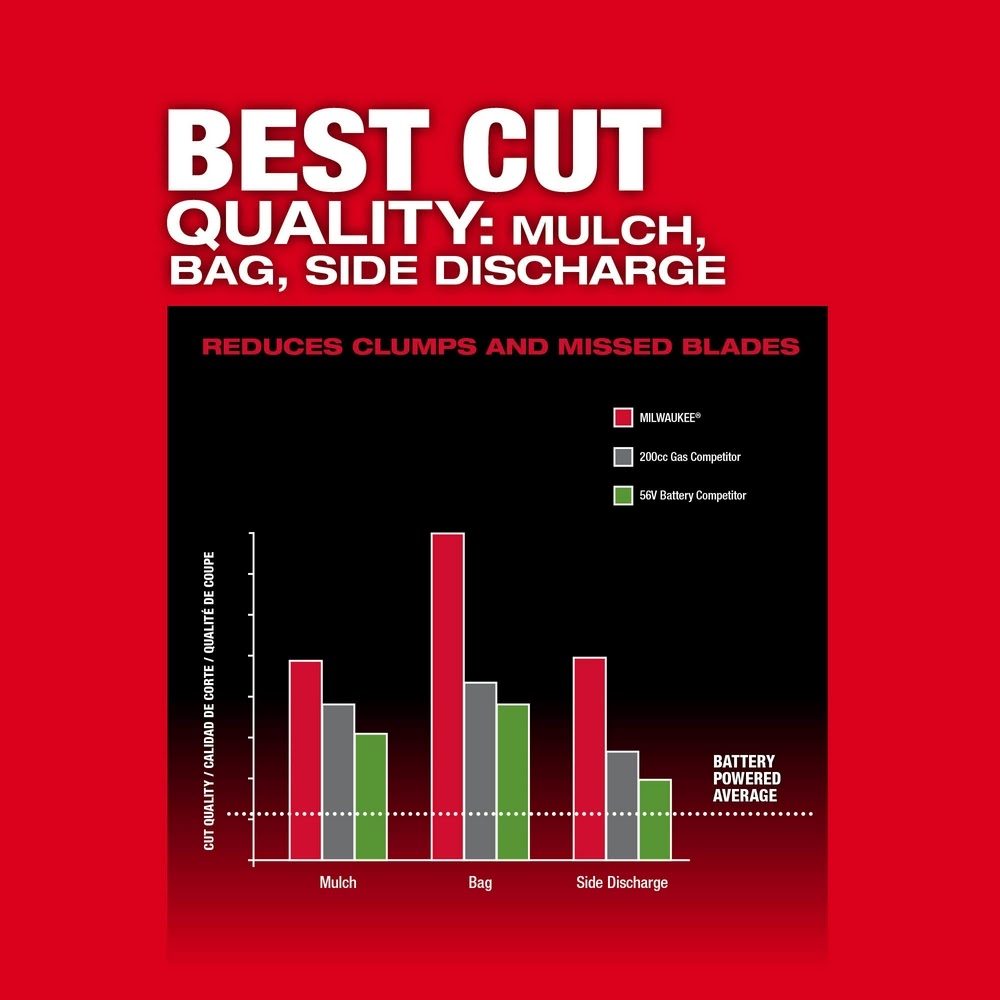 The MILWAUKEE M18 FUEL 21 Self-Propelled Dual Battery Mower Kit meets the performance, durability, and ergonomic needs of landscape maintenance professionals. The optimized steel deck design paired with higher blade speed allows the battery-powered lawn mower to achieve superior airflow and increased lift to deliver the best cut quality in mulching, bagging, and side discharge applications. The POWERSTATE Brushless Motor delivers more max torque than 200cc gas to take on the most demanding mowing applications. Milwaukee REDLINK PLUS Intelligence offers total system communication between tool and battery for unmatched levels of performance, protection, and productivity. The advanced electronic package also delivers an instant throttle response on both the lawn mower blade and drive motors to reach full throttle in under 1 second, which increases control and productivity. The mower requires 2 M18 REDLITHIUM Batteries for operation. When paired with 2 M18 REDLITHIUM HIGH OUTPUT HD12.0 batteries (not included), the mower delivers up to 60 minutes of runtime, allowing up to 1/2 acre of cutting when removing 1 of grass at a 3 MPH self-propelled pace. The Variable Speed Self-Propelled Mower offers speeds between 0 - 4 MPH, and the Active Speed Management Paddles allow users to easily adjust their walking pace while in operation to increase control. This battery-operated self-propelled lawn mower features a steel deck, 3-in-1 grass management, single point height adjustment, high lift mode, front & side LED lights, vertical storage, and two deck handles. The M18 FUEL 21 Self-Propelled Dual Battery Mower is part of the M18 System, fully compatible with over 250 solutions.