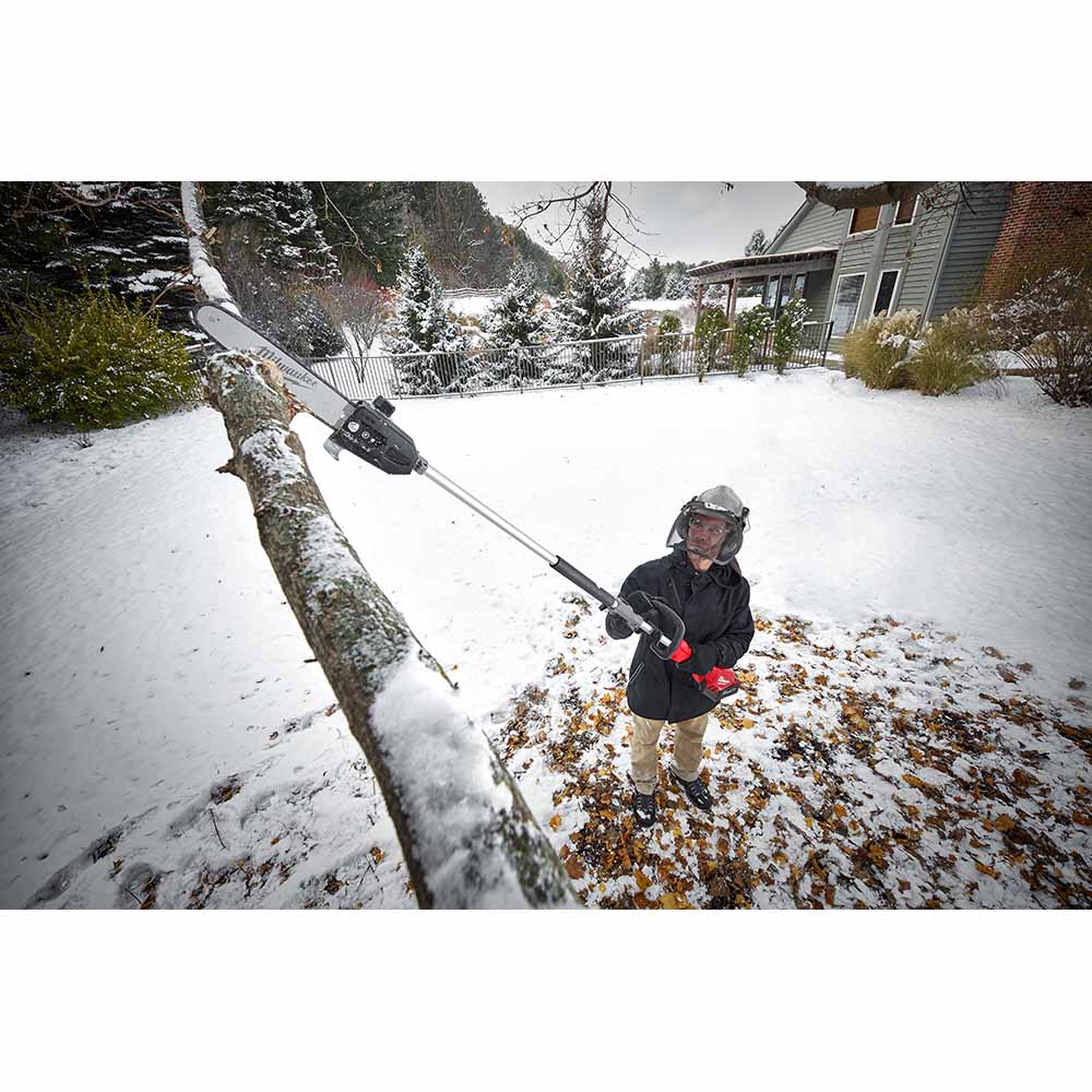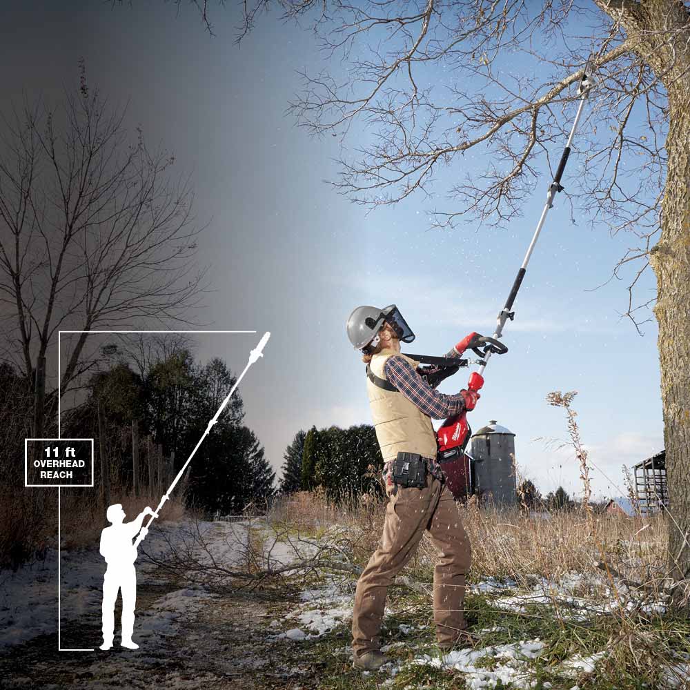 The MILWAUKEE® M18 FUEL™ 10 Pole Saw w/ QUIK-LOK™ kit gives users the power to cut hardwood branches, reaches full throttle in under 1 second, and delivers up to 150 cuts per charge. The cordless pole saw is made up of two components – the M18 FUEL™ Power Head w/ QUIK-LOK™ and QUIK-LOK™ 10 Pole Saw Attachment. This M18 FUEL™ Power Head, part of the M18 FUEL™ QUIK-LOK™ Attachment System, is compatible with multiple attachments such as an Edger, Articulating Hedge Trimmer, and String Trimmer attachment. This gives users the ability to quickly swap out attachments on a single Power Head, delivering ultimate versatility and a lower cost of ownership. The POWERSTATE™ Brushless Motor gives users the power to maintain its speed in demanding applications without bogging down, outperforming higher voltage systems. The Motor is positioned in the rear of pole saw to provide the best combination of power, balance, and maneuverability. REDLINK PLUS™ intelligence gives users maximum performance and protection from overload, overheating and over discharge. The advanced electronic package also delivers instantaneous throttle response and a variable speed trigger giving users ultimate control over the power range. The M18™ REDLITHIUM™ HIGH OUTPUT™ XC8.0 Battery gives users best in class performance in all applications and delivers up to 150 cuts per charge. The M18 FUEL™ 10 Pole Saw w/ QUIK-LOK™ is part of the M18™ system which is fully compatible with over 200 tools. In addition to the cordless pole saw, the kit includes a 3 Attachment Extension, Shoulder Strap, one M18™ REDLITHIUM™ HIGH OUTPUT™ XC8.0 Battery and an M18™/M12™ Rapid Charger.