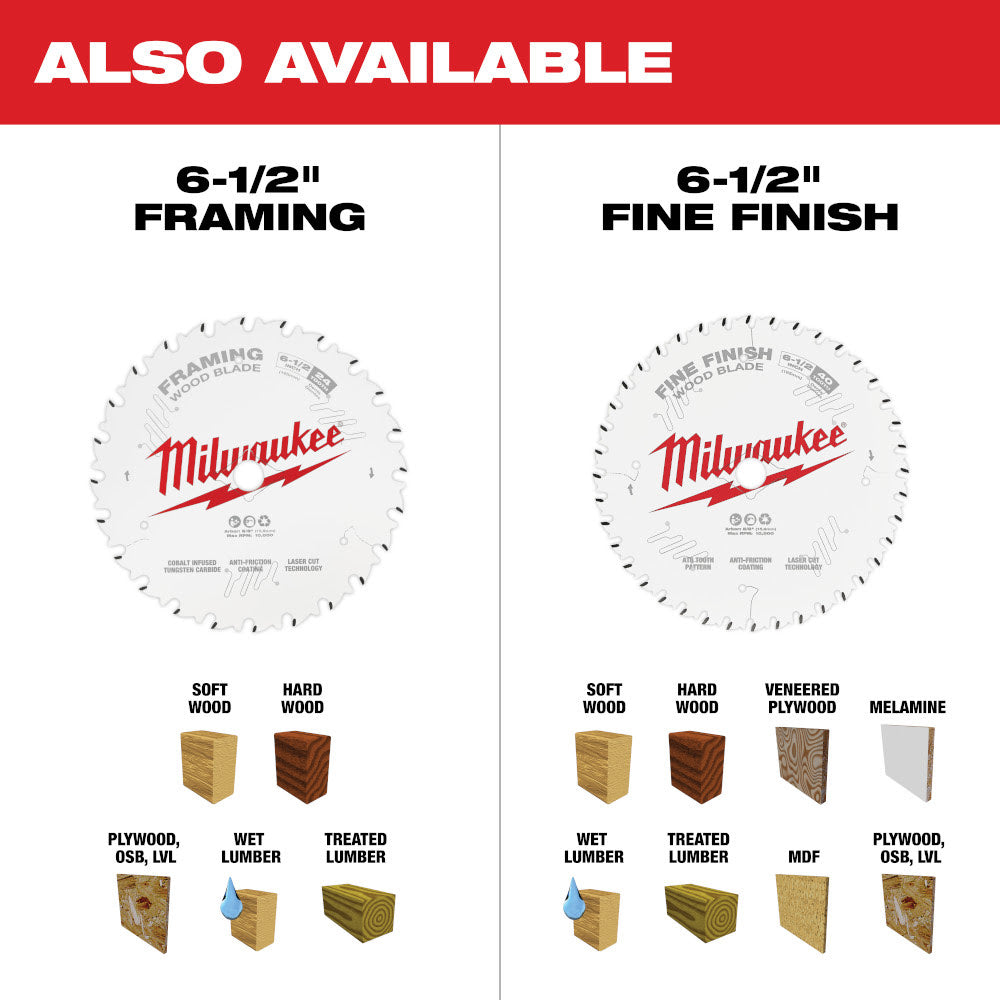 The MILWAUKEE M18 FUEL 6-1/2” Circular Saw is designed for the professional carpenter, remodeler, and general contractors who rely on high-performing and durable tools. This saw offers class-leading performance, delivering up to 20% more power and up to 40% faster cut speed. The POWERSTATE Brushless Motor spins the blade at 6,000 RPM, maintaining high speed under load, providing users the ability to complete their most demanding applications efficiently. The REDLINK PLUS Electronics ensures maximum tool performance and protection from overload, overheating, and over-discharge. When paired with an M18 REDLITHIUM HIGH OUTPUT XC6.0 Battery (not included) this saw delivers 300 cuts per charge and is fully compatible with all M18 REDLITHIUM batteries. The lightweight, ergonomic design paired with a robust belt hook allows for increased portability and makes it the perfect solution for completing difficult-to-access cuts. Positive bevel detents and new-to-world depth detents offer added productivity and reduce downtime. Additionally, the saw has an electric blade break, LED work light, rafter hook, and all magnesium guards and shoes, keeping the user productive and providing the durability to handle the toughest job site conditions.