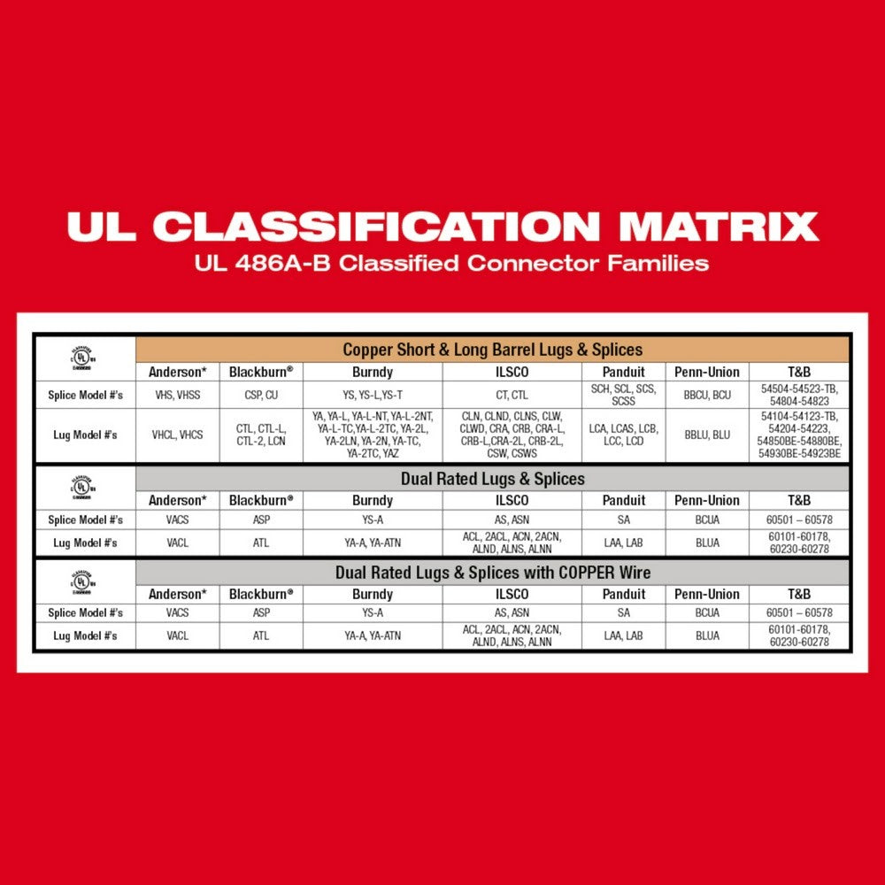 • Creates UL Classified crimps under UL 486A-B for #8 – 750 MCM Cu and Dual Rated lugs and splices across several leading manufacturers when used with corresponding Milwaukee dies