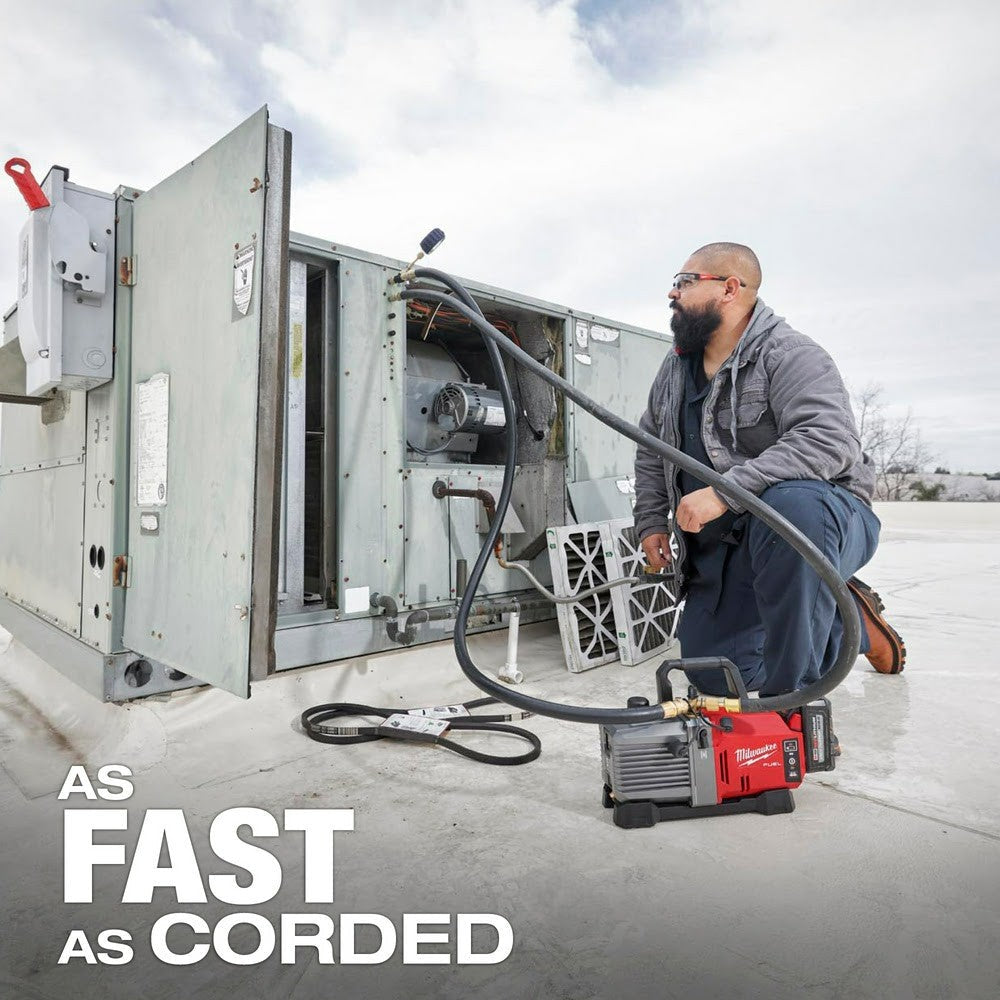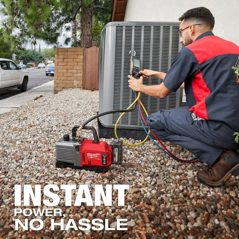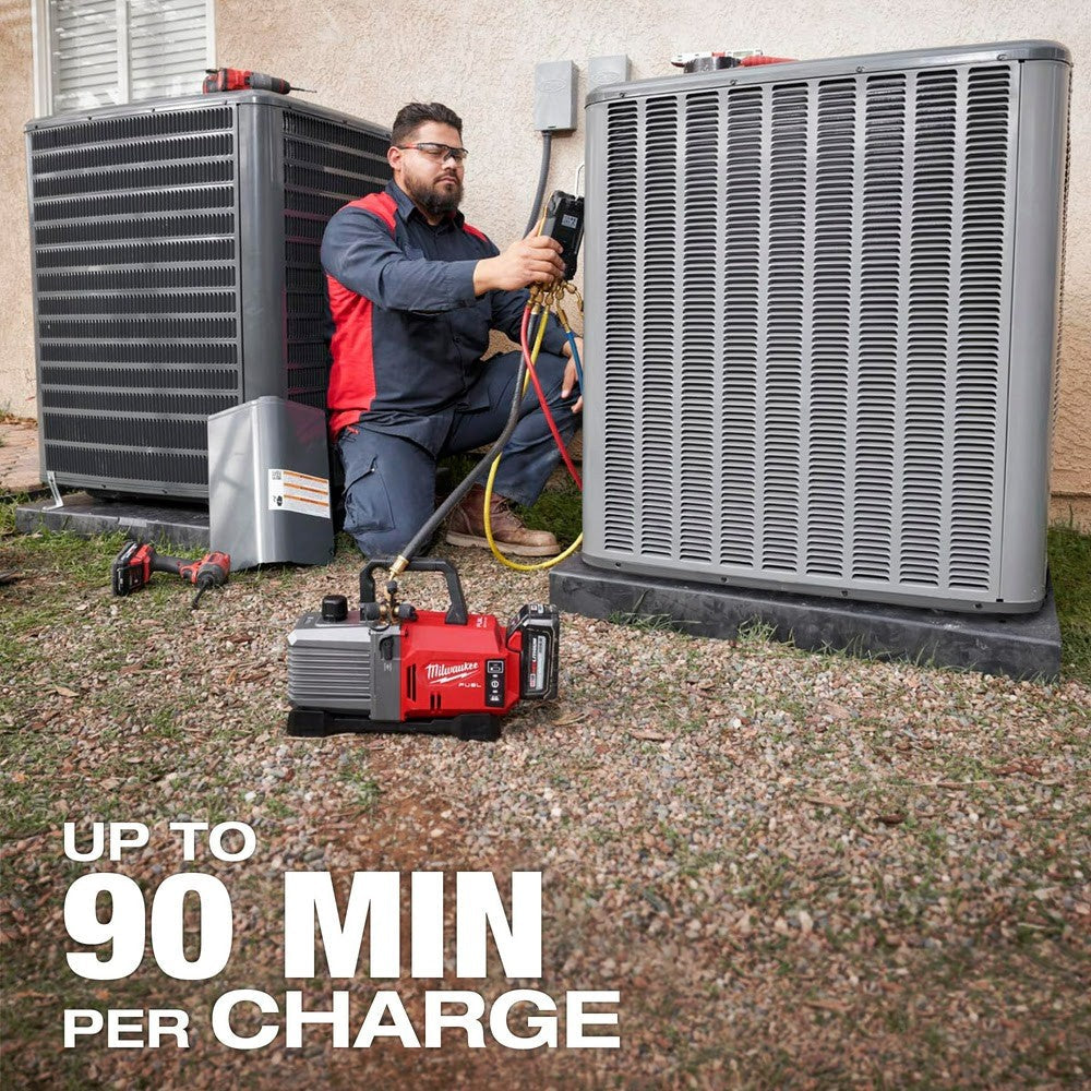 The MILWAUKEE M18 FUEL 5 CFM Vacuum Pump eliminates the hassle of cords and provides instant power for fast evacuations. Powered by M18 REDLITHIUM, this pump delivers the runtime to complete multiple jobs on one charge. With the innovation of manifold mode, the M18 FUEL 5 CFM Vacuum Pump allows you to maximize your speed and runtime in manifold setups, enabling up to 90 minutes of runtime per charge. This compact vacuum pump features a POWERSTATE Brushless Motor to enable corded speed during system pulldowns. The pump’s 1/2, 3/8, and ¼ port offerings deliver fast evacuations, especially when used with large hoses. The M18 FUEL 5 CFM Vacuum Pump is equipped with REDLINK PLUS Intelligence to ensure maximum performance and protection from overload.