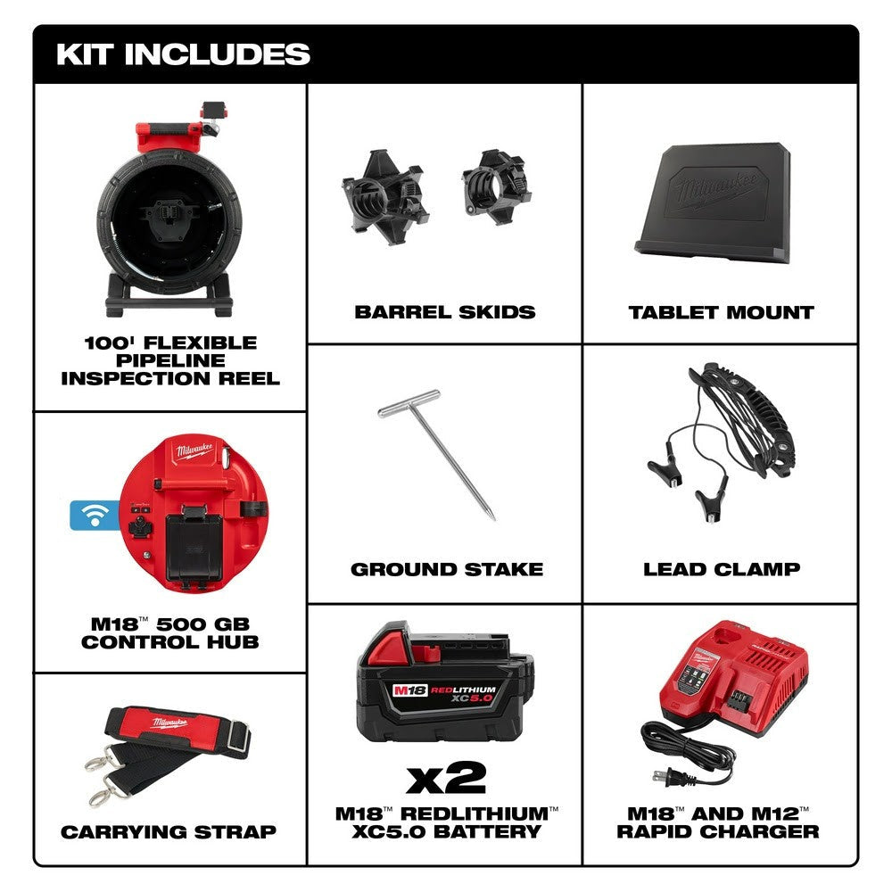The MILWAUKEE M18 100’ Flexible Pipeline Inspection System has a flexible push cable providing the ability to navigate tight bends and traps, while delivering the clearest image and easiest inspections in 1.5- 4” lines up to 100’. Featuring the industry’s shortest 25 mm 1080p self-leveling HD camera head, and the ability to digitally zoom up to 4X and pan, technicians can now see more in drain lines than ever before. This system features a lightweight, compact design making this Milwaukees most portable inspection camera kit. Powered by M18 REDLITHIUM 5.0 batteries, the M18 500GB Control Hub powers the reels, stores recordings, and easily swaps between reel sizes delivering unmatched system versatility. Capture, create, and share custom photos and videos from the M18 Wireless Monitor or directly from a tablet or mobile device for faster sharing of findings. This sewer line camera is also equipped with ONE-KEY Technology, providing you with the ability to track the tools location, manage it in inventory, and lock the tool out to help protect your investment.