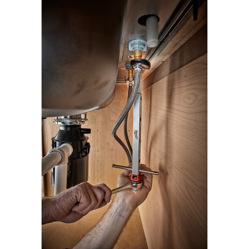 The Milwaukee 1.25 Basin Wrench is designed for the industrys easiest basin swap-outs in under sink applications and extremely tight spaces. The Milwaukee Basin Wrench features an ergonomic handle, designed to fit in the palm for maximum efficiency and comfort. A new-to-world ratchet ready and screwdriver ready handle allows for maximum speed and break-away torque for difficult to remove or corroded fasteners. Featuring a forged and hardened jaw with an optimized tooth pattern, the Milwaukee Basin Wrench provides maximum grip and durability. The telescoping handle is designed to allow for easy adjustment between handle lengths.