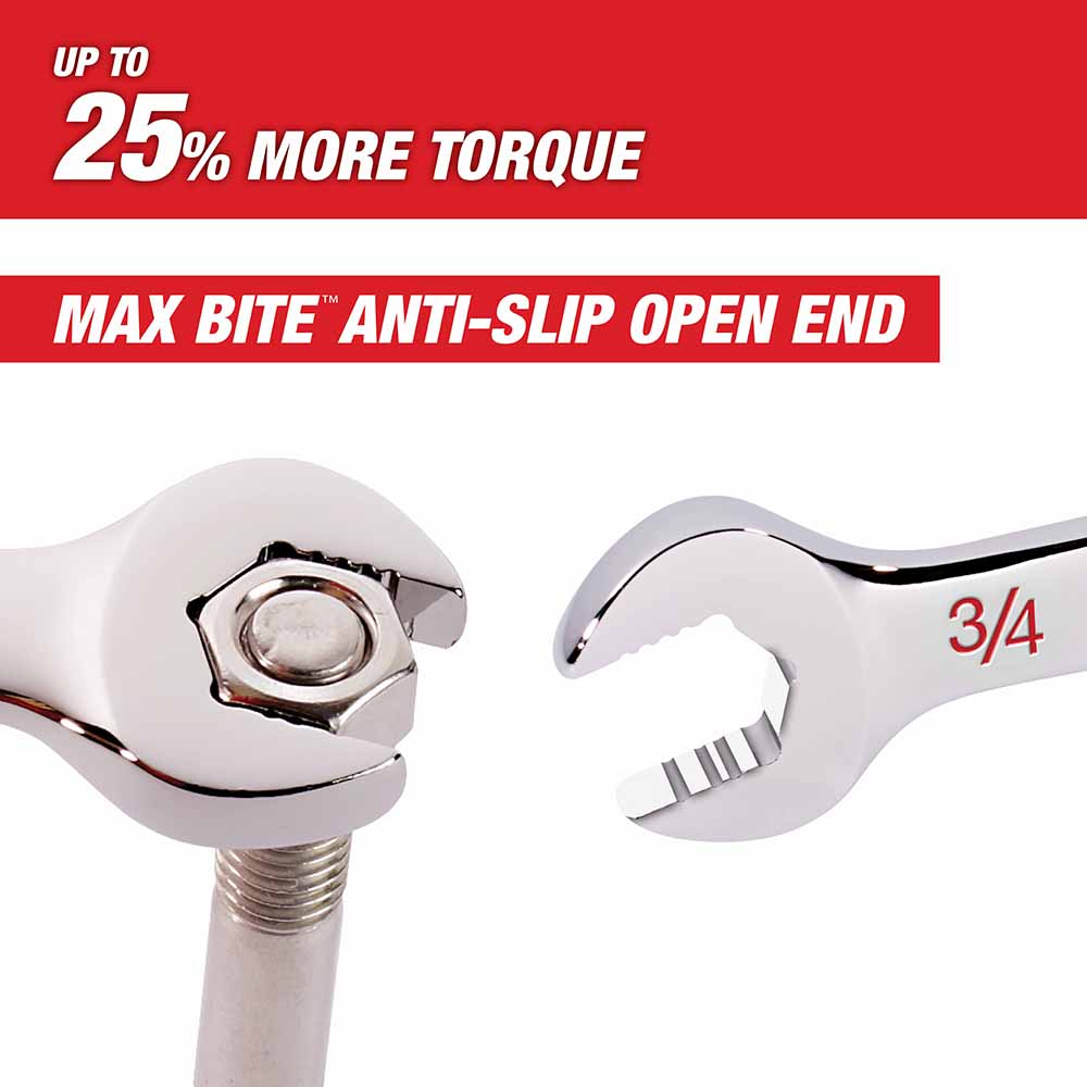Milwaukee has designed our Combination Wrenches from the ground up, delivering maximum torque and ultimate user comfort. The MAX BITE™ Open-End Grip improves the wrenchs grip on nuts and bolts, and the geometry reduces rounding and stripping. MAX BITE™ offers 25% More Torque than competitive wrench designs. The Comfortable I-Beam Handle Design allows superior user comfort, even while applying high torque. Milwaukee wrenches feature Ink-Filled Size Labels for easy size identification, and quick distinction between SAE and metric sets. The 15pc kits come in