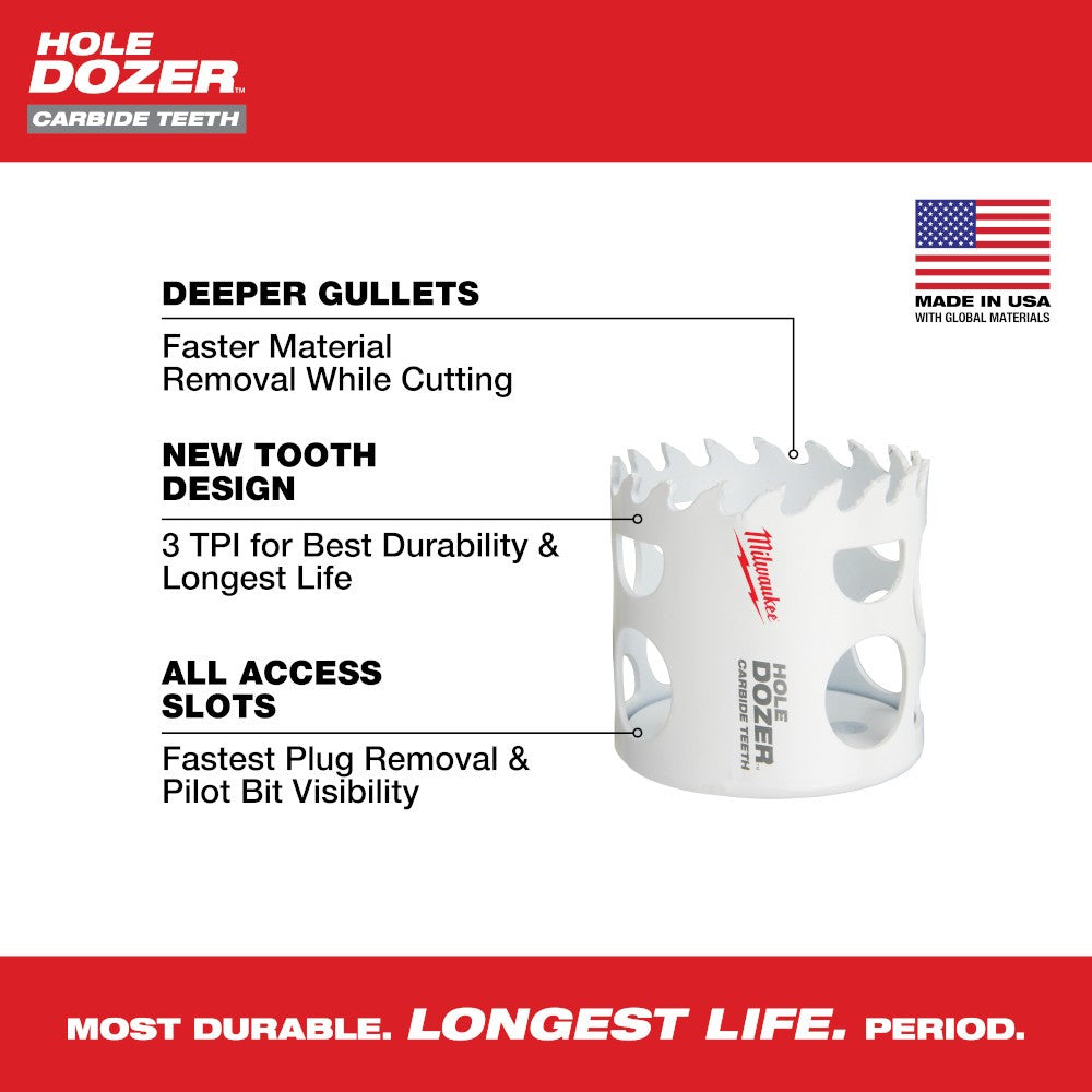 Milwaukee® Hole Dozer™ with Carbide Teeth hole saws provide 50X Life in Extreme Multi-Material cutting applications when compared to bi-metal hole saws. Built utilizing a tough carbide grade combined with a durable 4TPI design, yielding the best tooth durability and longest life in Stainless Steel, Abrasive Materials and Fastener Embedded Wood. Cutting depth is 1.62, allowing clearance to handle cuts in all materials. With a Thermoset Coating to reduce friction and drag during cutting, users benefit from faster cutting and increased cordless efficiency. Slug removal is made easy with the Plug Jack™ T-Slots. Plug Jack™ enhanced user productivity by providing best access and leverage to remove material slugs. Hole Dozer™ with Carbide Teeth are made in USA.