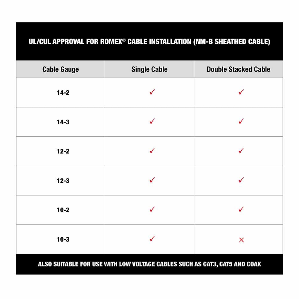 • UL/CUL approved for fastening single non-metallic cable: 14/2, 14/3, 12/2, 12/3, 10/2, 10/3 and double stacked non-metallic cable: 14/2, 14/3, 12/2, 12/3, 10/2