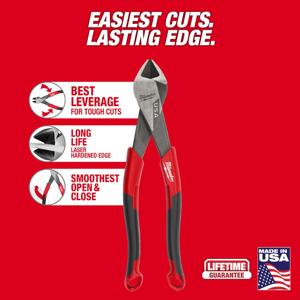 The Milwaukee 8 Diagonal Cutting Pliers (USA) deliver the easiest cuts and a lasting edge for the professional user. These pliers are designed with an optimized pivot point to provide the best leverage for tough cuts through materials like wires, screws, and other common hardware. The diagonal cutting pliers deliver the confidence of a long cut life with a laser-hardened edge. These diagonal cutting pliers are engineered to deliver the smoothest open and close experience from the start, with no break-in period required. The pliers are tether ready and offered in both dipped grip with a split-ring hole and comfort grip with a lanyard hole. Diagonal Cutting Pliers are available in sizes of 6-inch, 7-inch, and 8-inch. The Milwaukee Diagonal Cutting Pliers are made in USA with best-in-class manufacturing technology and USA-sourced materials, including durable, press-forged steel, and are backed by a complete Lifetime Guarantee.